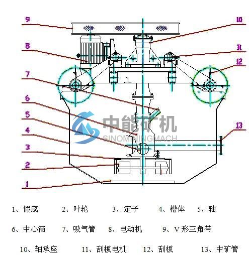 电机通过V带驱动主轴,使其下部的叶轮 转,空气经吸气管、中心筒被吸入到上叶轮腔,与被吸入的矿浆混合,形成矿化气泡, 对有用矿物进行分离,得到所需的矿物。